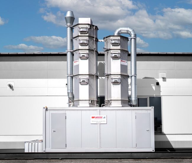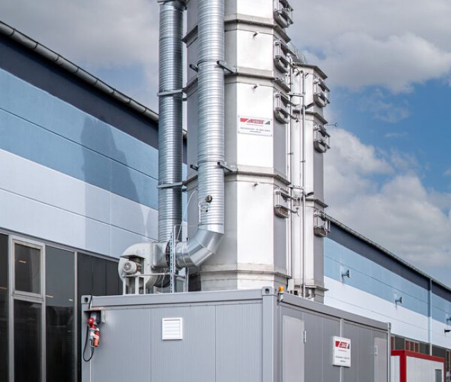 Wesentlicher Bestandteil der biologischen Abluftreinigung sind zwei zylindrische Reaktortürme, welche mit einem speziellen, strukturierten Trägermaterial gefüllt sind. Diese strukturierten Packungen werden mit einer Suspension aus Wasser, Mikroorganismen und Chemikalien beaufschlagt, wodurch sich ein Biofilm ausbildet