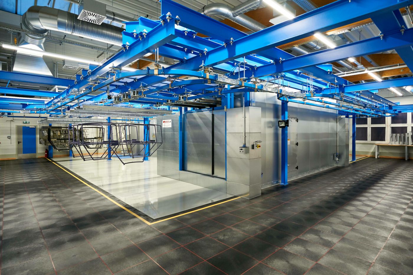 AFOTEK konzipierte ein hochflexibles Konzept, welches die Verkürzung der Durchlaufzeiten bei gleichzeitiger Erhöhung der Teilevielfalt garantiert. Die Anlage umfasst u.a. eine Taktvorbehandlungsanlage mit zwei Kammern, einen Haftwassertrockner, eine Großraumpulverkabine und einen Pulvereinbrennofen. Die Fördertechnik ist als Handschiebetechnik mit Teilautomatisierung ausgeführt.