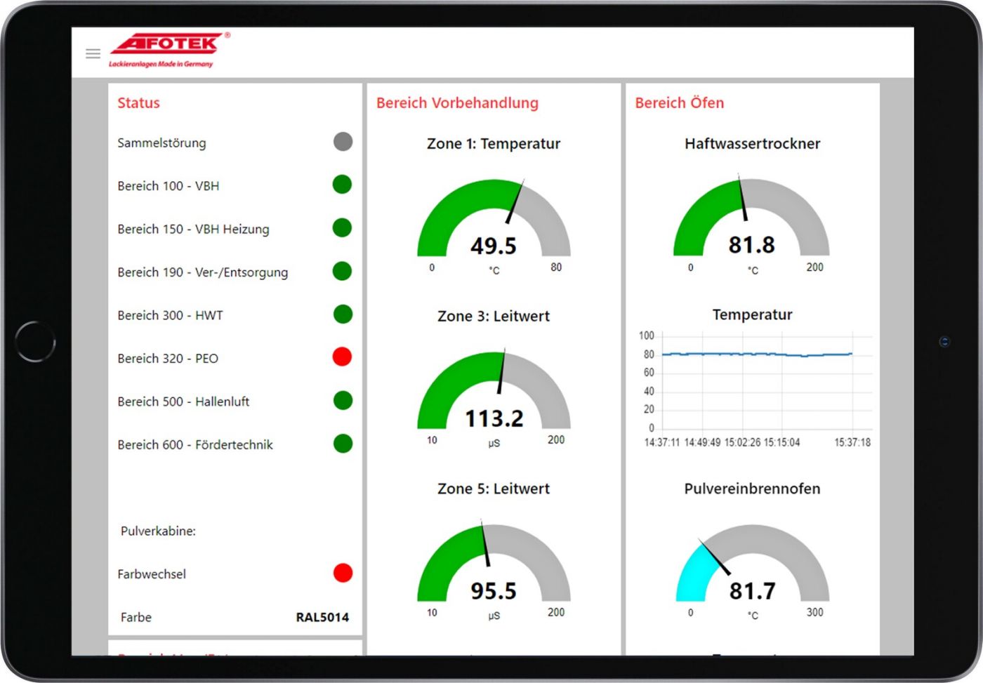 Das AFOTEK Dashboard ist eine plattformunabhängige Lösung auf Basis von OPC UA, die relevante Prozessdaten von Lackieranlagen übersichtlich und in Echtzeit visualisiert. Anlagenverantwortliche können so den Live-Status Ihrer Beschichtungsanlage von jedem Endgerät und von jedem Ort der Welt aus überprüfen. Neben der Lackieranlage lassen sich auch vor- und nachgelagerte Prozesse einbinden.